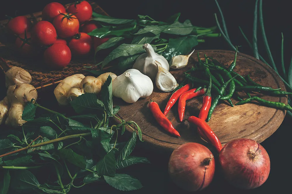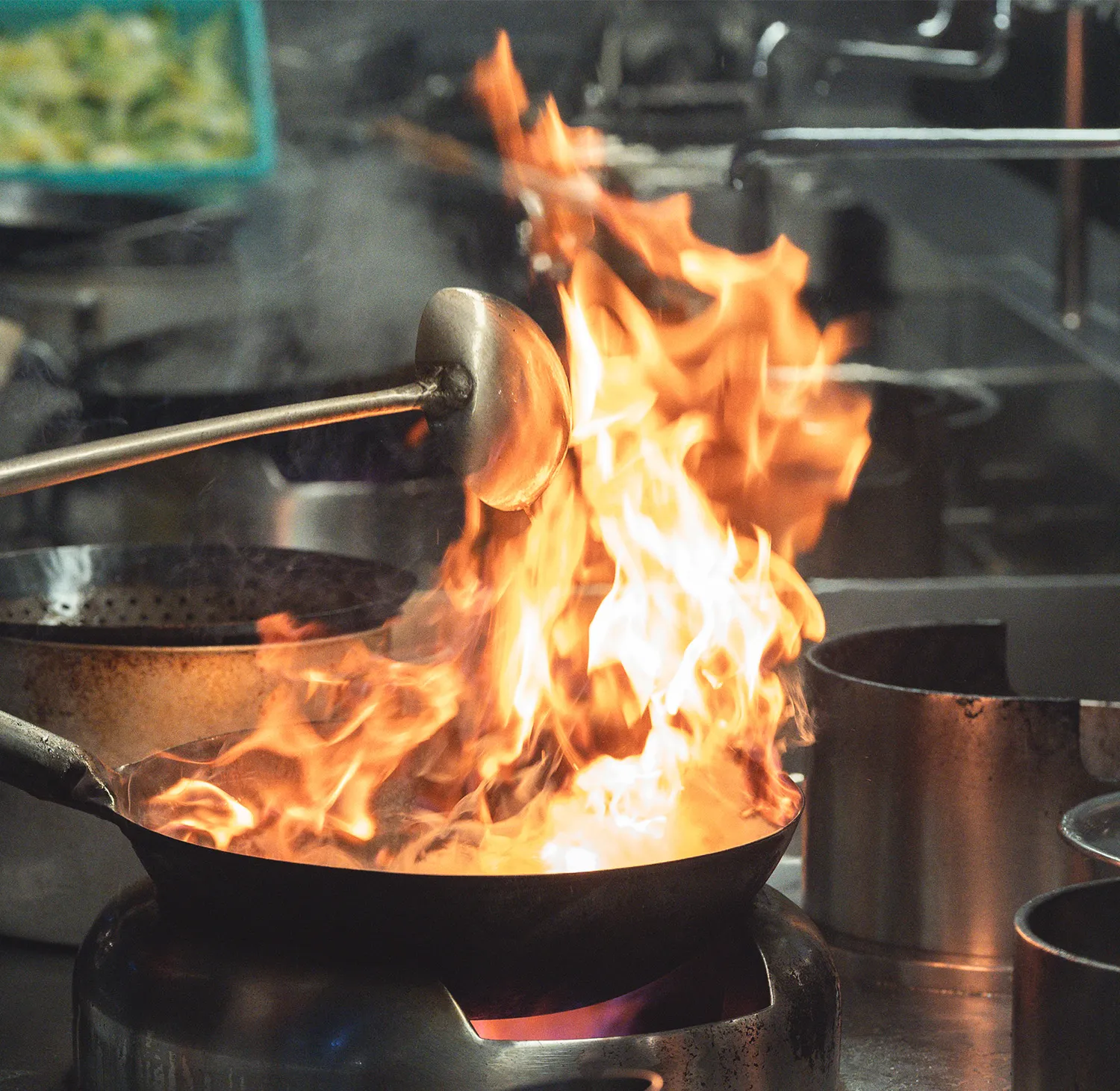 中華の炎と包丁、食材が重なり合って